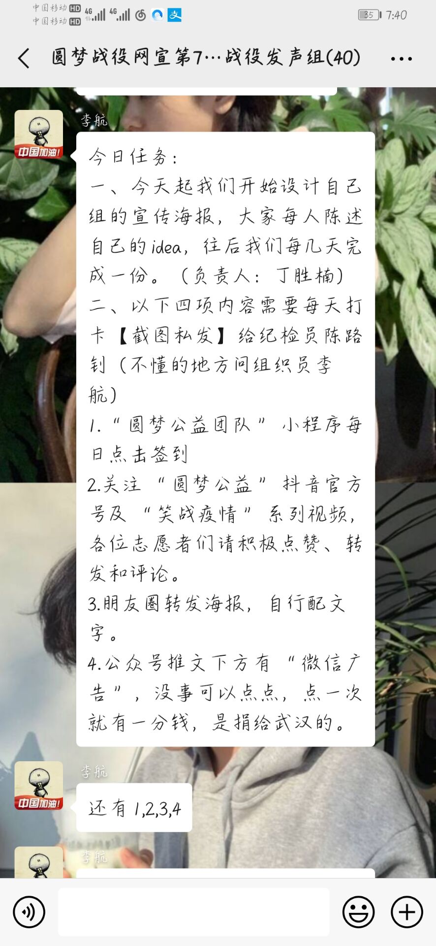 移商182班杨成霜说:“每天的工作就是转发一些关于疫情的最新消息,让人们知道疫情的情况。能为祖国出一份力是我觉得很有意义的一件事情,虽然我们的工作相比于在前线的工作者而言是不可比拟的,但是身为志愿者的我们一直都在为前线的战士们加油气。我希望的是有更多的人能够加入到我们的志愿者行列中来,我们还需要更多的力量,来打赢这场战疫。圆梦公益志愿团队主要是做线上志愿者,也就是网络志愿者,我们有明确的分组,每天的主要工作就是通过网络渠道让更多的人了解现在的疫情情况,每天会进行签到,由组长来通知今天的任务,然后我们会通过发朋友圈,微博,抖音,公众号等方式让更多的人了解疫情的现况。向大家普及正确的防护措施以及找寻筹集物资补给前线。”