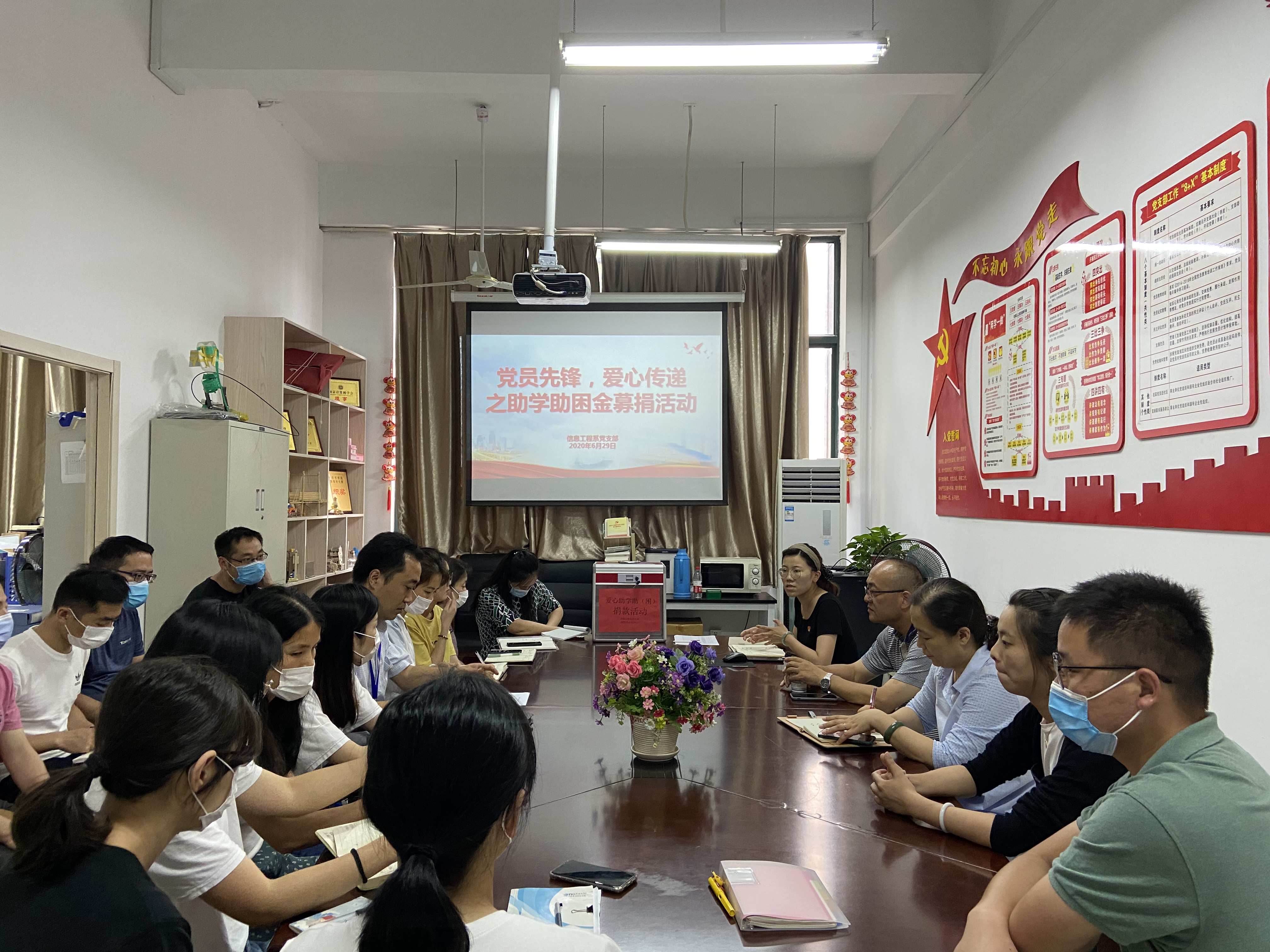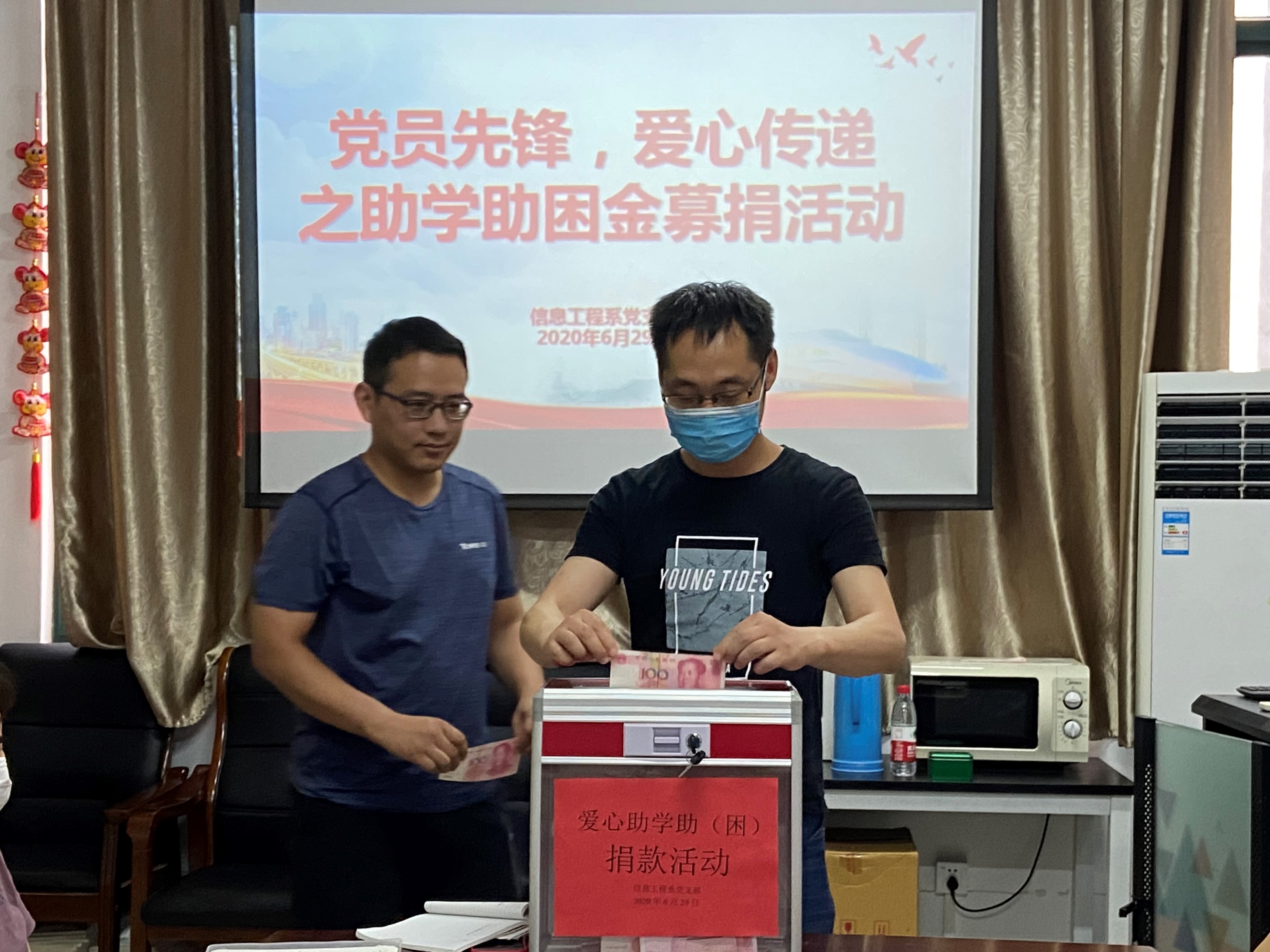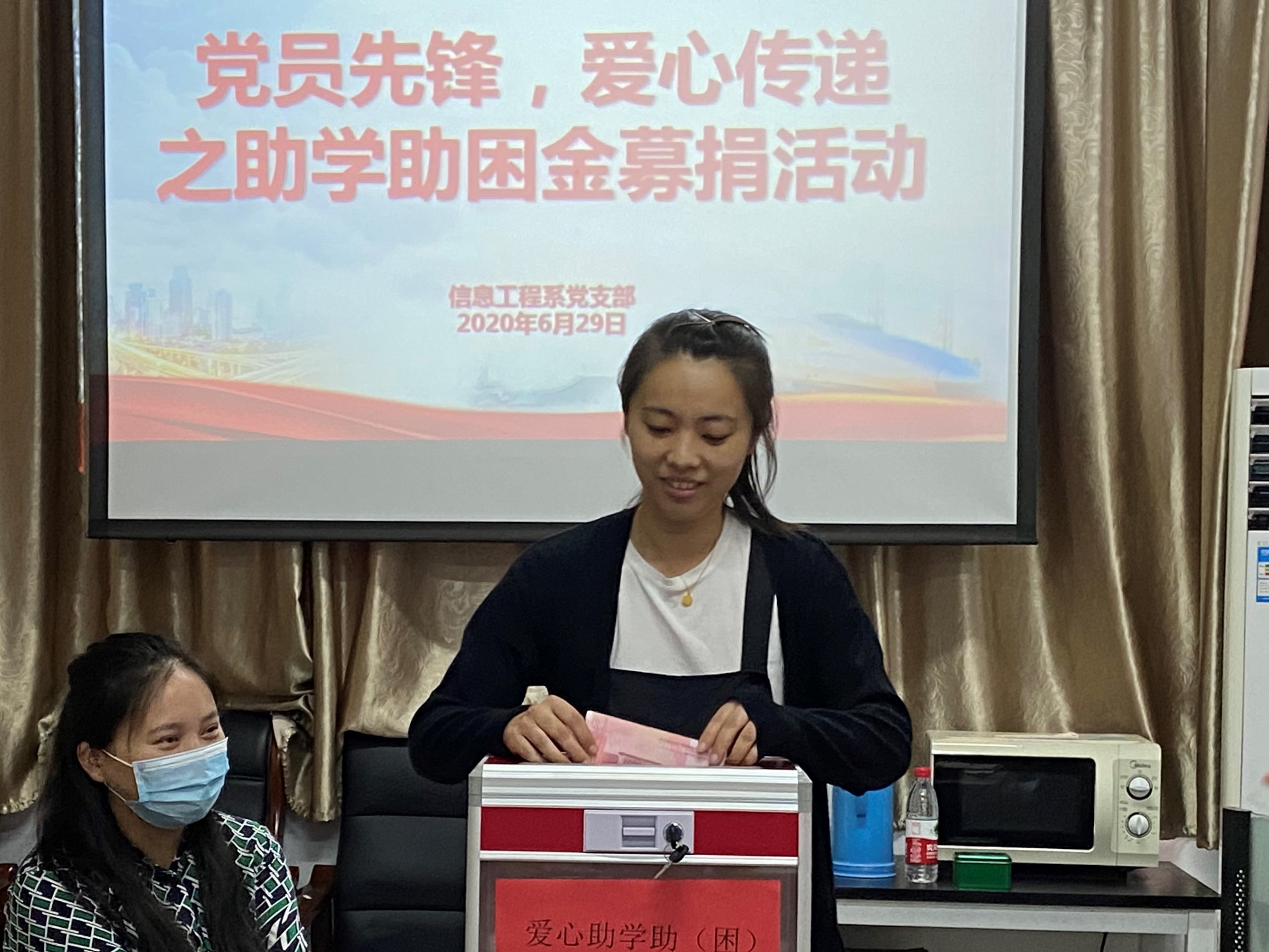 为深入贯彻落实党的十九大精神,弘扬中华民族扶危济困、助人为乐的传统美德,贯彻以人为本的理念,积极响应学院党委在全院各级党组织和全体党员中开展“七彩飞扬•五亮强基”品牌特色活动中的“暖心行动”,2020年6月29日,信息工程系党支部组织了一场爱心助学助困金募捐活动,支部全体党员参加活动,驻点领导副院长赵学洪也参加了本次活动。