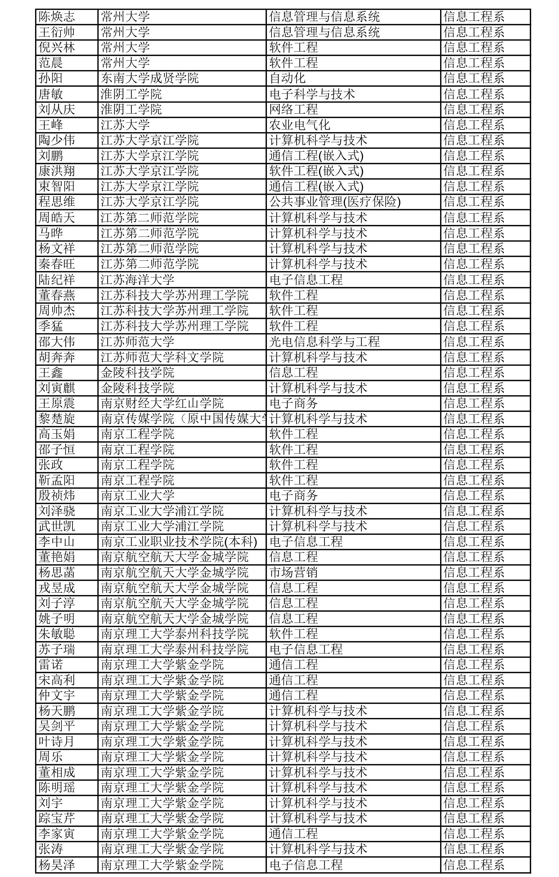 今年,信息工程系2020届毕业生共290人,其中参加专转本考试143人,达省控线94人,达线率达65.73%;理科280分以上18人,最高分326分;文科最高分302分。近日,从江苏省考试院收到2020年“专转本”选拔考试录取结果,我系各专业共有77名同学分别被扬州大学、常州大学、南京工业大学、南京邮电大学、南京信息工程大学、南京中医药大学、江苏海洋大学、江苏大学、江苏师范大学、江苏第二师范学院、南京工程学院、淮阴工学院、金陵科技学院、东南大学成贤学院、南京航空航天大学金城学院、南京理工大学紫金学院等32所本科院校录取。我系专转本考试多年来都能保持较高的录取率,同时系部还与南京邮电大学、扬州大学等本科高校合作,为学生提供多个升学渠道。多年来我系一方面紧抓高质量就业工作,一方面铺实高录取升学道路,以用心引领、暖心服务、真心付出,努力做到高质量的“以学生为本”。