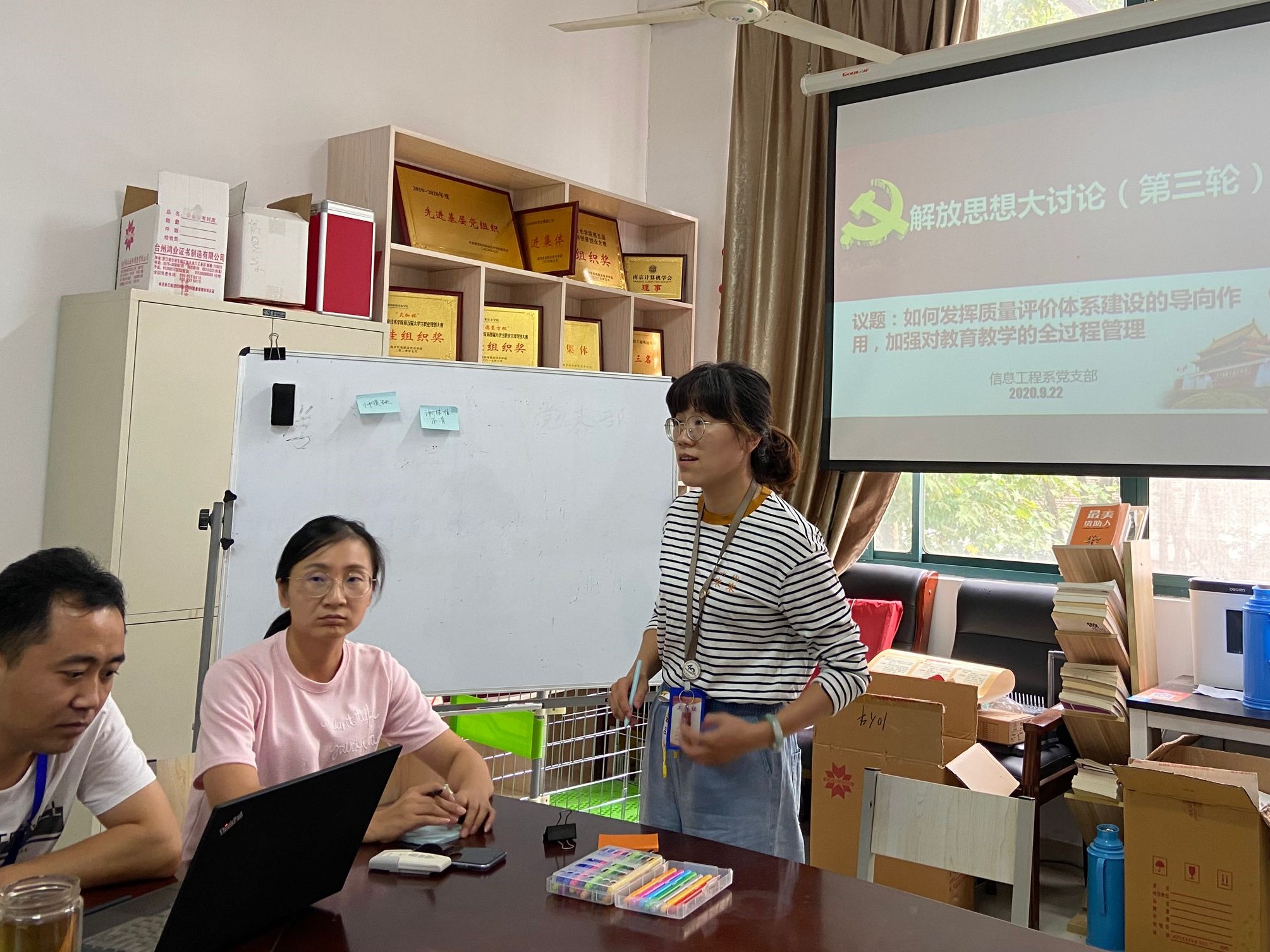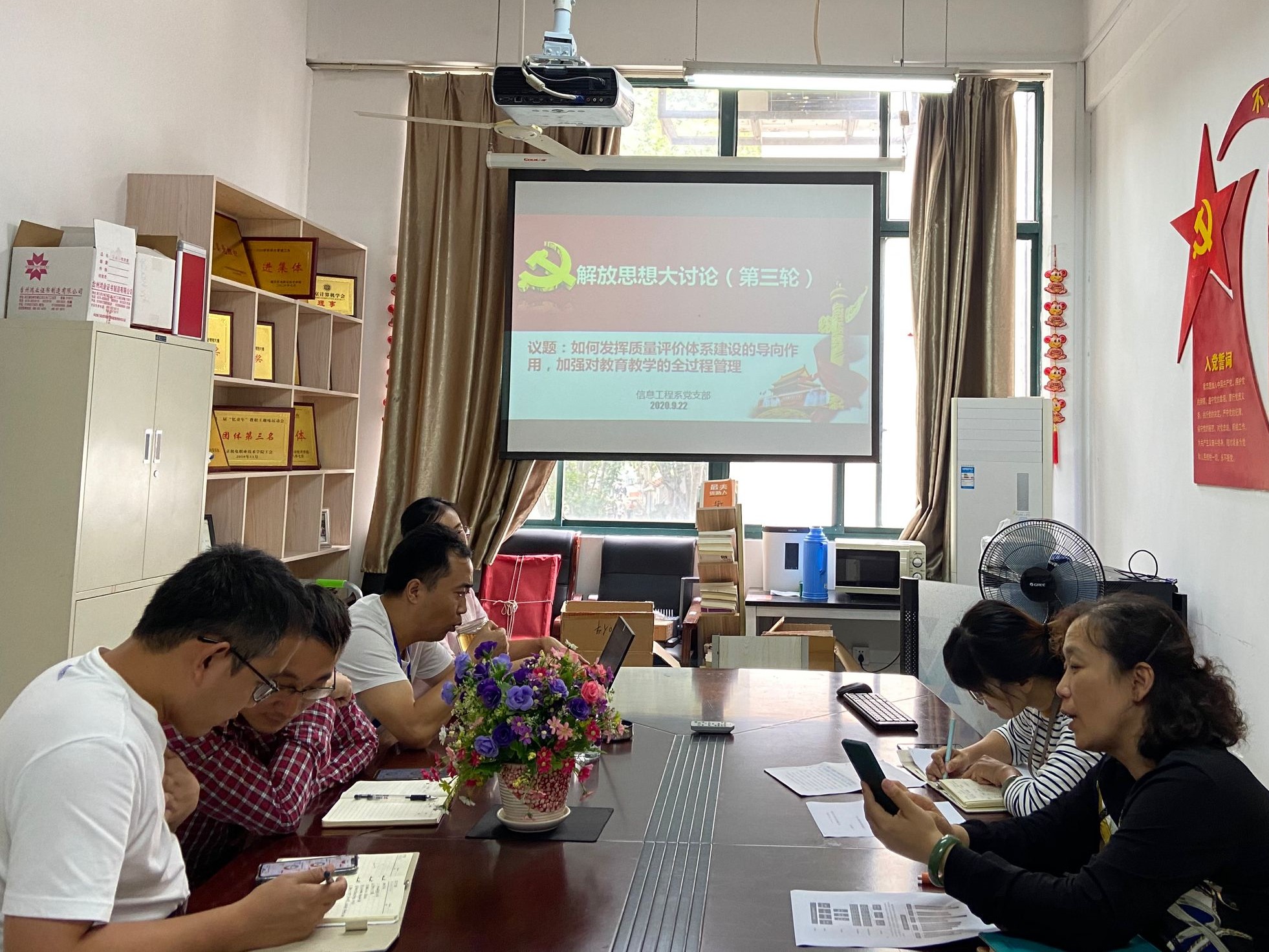 9月22日中午12:30,信息工程系党支部与系部骨干教师于笃行楼201会议室开展了主题为“发挥质量评价体系建设的导向作用,加强对教育教学的全过程管理”解放思想讨论活动,此次活动由信息工程系党支部书记胡枫主持。