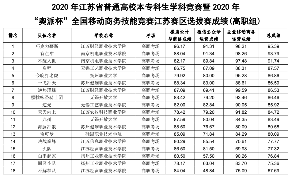 11月6日-8日,由全国电子商务职业教育教学指导委员会主办的面向职业院校电子商务类及相关专业的赛事“奥派杯”移动商务技能赛项在江苏财经职业技术学院举行,来自全省19所院校33支队伍的99名学生报名参赛。我院卢鹏程、骆兴雅、黄安男3位同学所组成的有点甜团队在与传统强队的激烈博弈中以微信公众号小组第一名,运营第二名,总成绩第2名的优异成绩荣获一等奖。由鲍宇涵、赵晨、颜颖3位同学所组成的团队以总成绩第3名的优异成绩荣获二等奖。