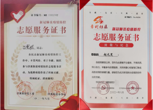 在志愿服务期间赵元昊同学作为志愿者不分昼夜,不惧风雨,与其他的志愿者一起将爱心凝聚成战胜疫情的磅礴力量。他得到了江宁区东山街道章村社区居委会的认可,同时他还表示在今后的生活中会做一名品学兼优的大学生。
