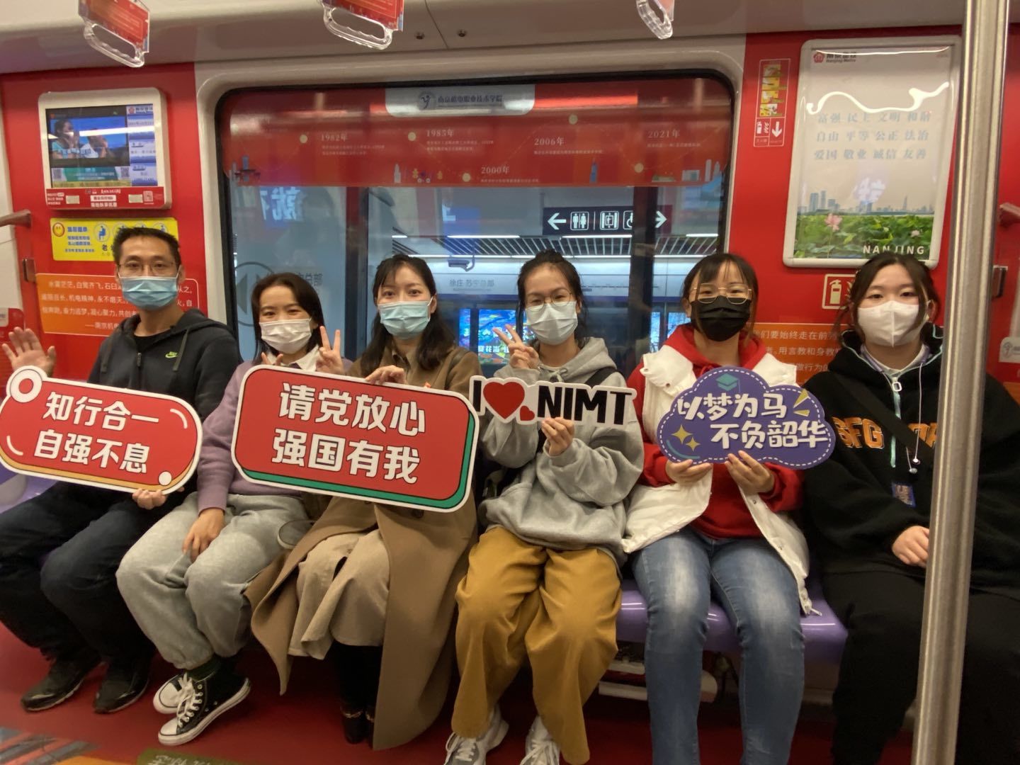 “遇见宁——最美大学时光”红色地铁专列发车,熟悉的南机电风景,动人的南机电故事,一篇篇一幅幅一帧帧尽显这车厢中。全车共6节车厢,以红色、橘色为主色调,讲述12所高校历史上的大事件、校史中的党史故事、学校开展党史学习教育的成果等遍布车身、车窗、椅背贴、拉手等地方。
