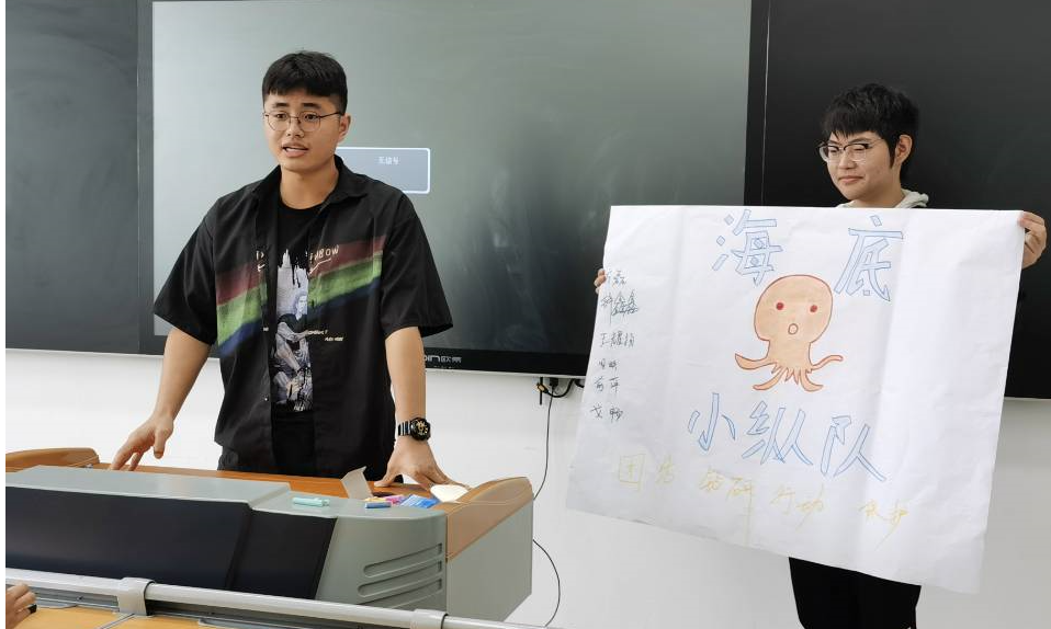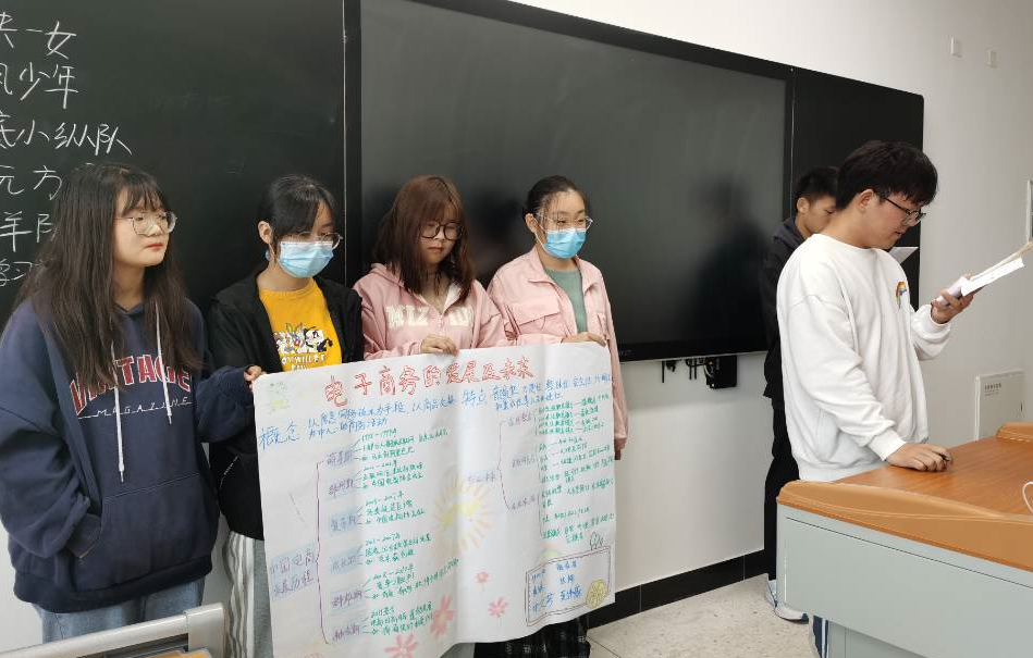由于21级同学们刚进校,彼此之间还不熟悉,因此课程中安排了“破冰”环节。将班级同学分组,男女搭配,5-6人/组,每个组自拟一个队名,设计队徽,并为自己的队伍设计一句口号,每个小组上台介绍自己的队伍,然后通过互动游戏让每个小组的同学快速熟悉起来。后续课程进行过程中一共安排了“电子商务的发展与未来”、“高淳中科游子品牌营销策略”、“移动商务的岗位能力需求”、“我的创业计划”四个不同主题,每个主题活动的开展都依托小组进行,每个知识点或者讨论内容,小组成员需要运用图片、文字或者思维导图的形式,在纸张上进行呈现,小组成员轮流进行汇报。