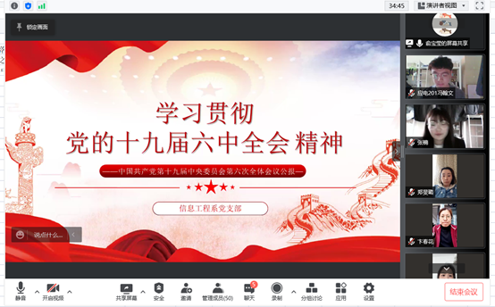 3月29日,信息工程系党支部在疫情期间坚持学习防疫两不误,支部结合当前防疫形势,依托腾讯会议开展线上政治理论学习,配合主题党日活动,进一步提升党员先进性,引导党员立足本职、同心战“疫”,会议由支部书记吴伟萍主持,支部全体党员及普通教职工参加会议。