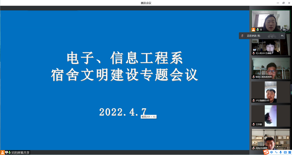 为积极响应疫情防控要求,营造干净整洁的宿舍卫生环境。2022年4月7日下午,电子工程系与信息工程系共同召开了宿舍文明建设专题会议,本次会议系部书记吴伟萍主持,电子工程系与信息工程系主席团成员、生活部部长、各班班长、副班长、生活委员出席会议。