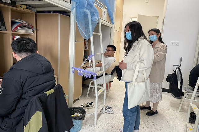 为更好地推进疫情防控工作,了解疫情防控之下学生在宿舍的日常生活、学习动态,2022年4月10日,信息工程系心理气象站王林林老师陪同学院各系心理气象站老师深入在校学生宿舍进行走访。