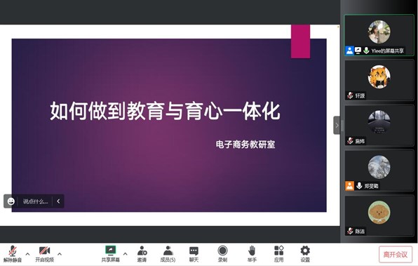 11月29日下午,电子商务教研室通过腾讯会议,在线上针对“如何做到教育与育心一体化”开展教研活动。此次教研活动由电子商务教研室主任施炜主持,全体教研室教师参加活动。