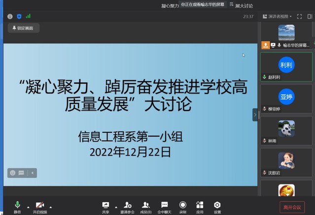 为全面落实学校党委关于开展“凝心聚力 踔厉奋发 推进学校高质量发展”大讨论活动的通知精神,信息工程系党支部于2022年12月19日至12月23日期间组织支部全体教师开展了以“凝心聚力 踔厉奋发 推进学校高质量发展”为主题思想大讨论,探讨学校高质量发展的方向和目标。本次活动由支部书记胡枫组织,全体教师参加讨论。