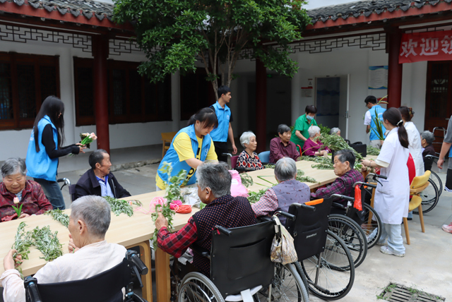 活动前期,由信息工程系团委书记沈歆岩及自动化系团委书记周笛共同对本次敬老院活动流程进行讲解,随后便带领志愿者们摆放桌椅,以便老人们入座。志愿者们在负责人的调动下分工明确,有的在摆放桌椅,以便老人更好的落座;有的在收拾艾草,有的在挑选花朵,有的在准备编织的绳子。随着准备工作的逐步落实,活动也就此展开,志愿者们先为老人们分发了艾草、粽叶、荷花,与老人们共同编织象征端午节"吉利"的花束,志愿者一边与老人共同编织花束,一边交流着端午节的习俗和故事,他们的到来为平日里稍显安静的护理院增添了许多欢声笑语。同时,志愿者与老人们亲切交谈,了解他们的日常生活和健康状况,并为他们送上精心准备的节日礼物。