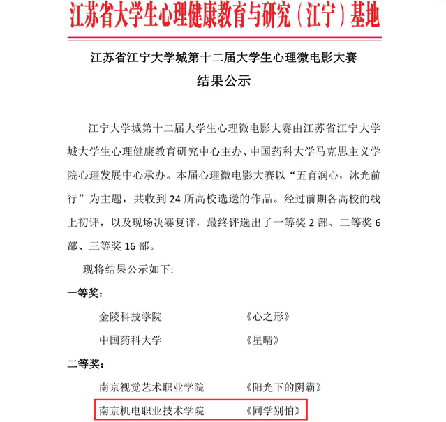 喜报:我系学子荣获江苏省江宁大学城第十二届大学生心理微电影二等奖