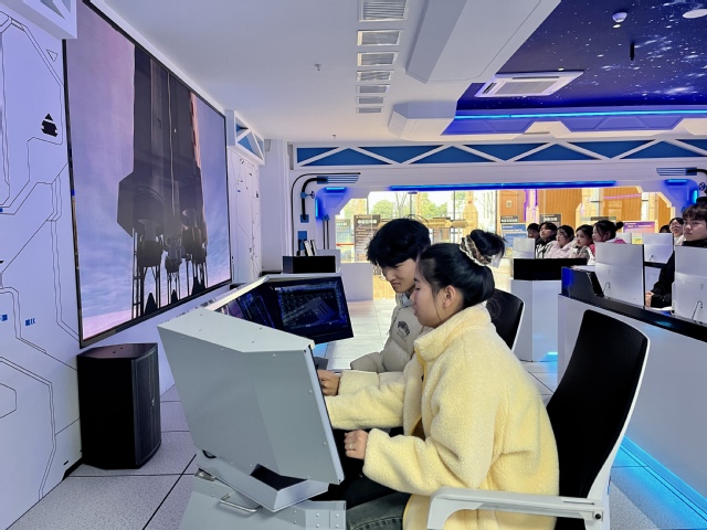 课上,两位同学坐在控制台沉浸式体验了火箭从发射准备、点火升空,到进入预定轨道的全部过程。学生们仿佛身临其境,感受到了火箭发射时的震撼与激情。