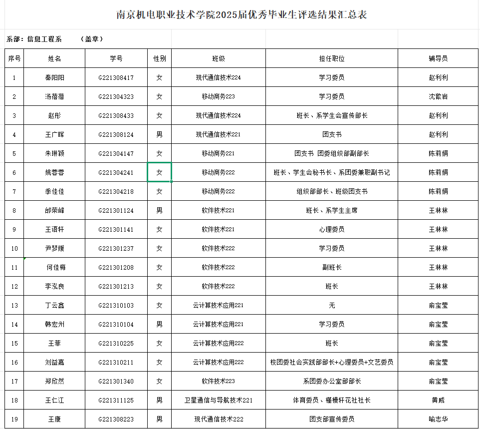 根据《关于评选2025届优秀毕业生的通知》(南机电院学﹝2025﹞4号)文件精神,经班级评选,系部审核,决定拟推荐以下17名同学为2025届乐投线上平台(集团)官方网站优秀毕业生。现予以公示,公示时间:2025年4月24日——2025年4月26日。联系人:郝麒,电话:18061237654。