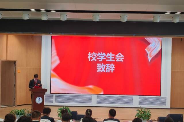 校学生会主席团代表胡子豪上台致辞。致辞中,他表达了对学校和系部学生会未来工作的期望,希望双方能够进一步加强交流合作,携手共进,为学生们创造更多学习、成长和锻炼的机会。
