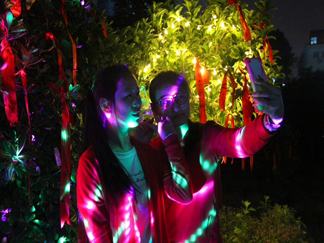 夜晚,许愿树炫目的光彩更成了学生公寓里的一道亮丽的风景,她带着同学们的祝福,怀揣着大家的梦想,绽放最耀眼的的光芒,承载着我们的希望永不言弃。