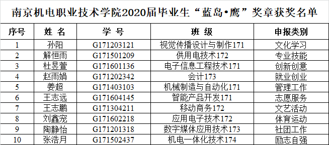 根据《乐投线上平台(集团)官方网站关于开展2020届毕业生“蓝岛•鹰”奖章评选推荐工作的通知》,经系部评审小组初步审核,学工处复核,专家评审组评审,决定拟推荐以下10名同学为2020届毕业生“蓝岛•鹰”奖章获得者。现予以公示,公示时间:2020年7月2日—2020年7月6日。联系人:宁燕,电话:025-84190262。