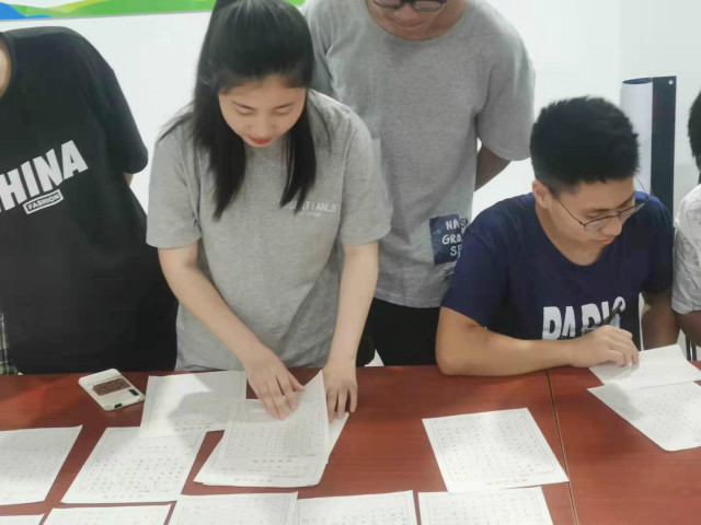 书法比赛活动开始,机械工程系学生资助宣传大使张弟同学阐述了此次活动的目的和相关要求,并邀请院社团联合会书法社社长段慧琳及其他两名社员作为评审。活动过程中,书法社社长对参赛选手的书法作品和书写手法进行指导。