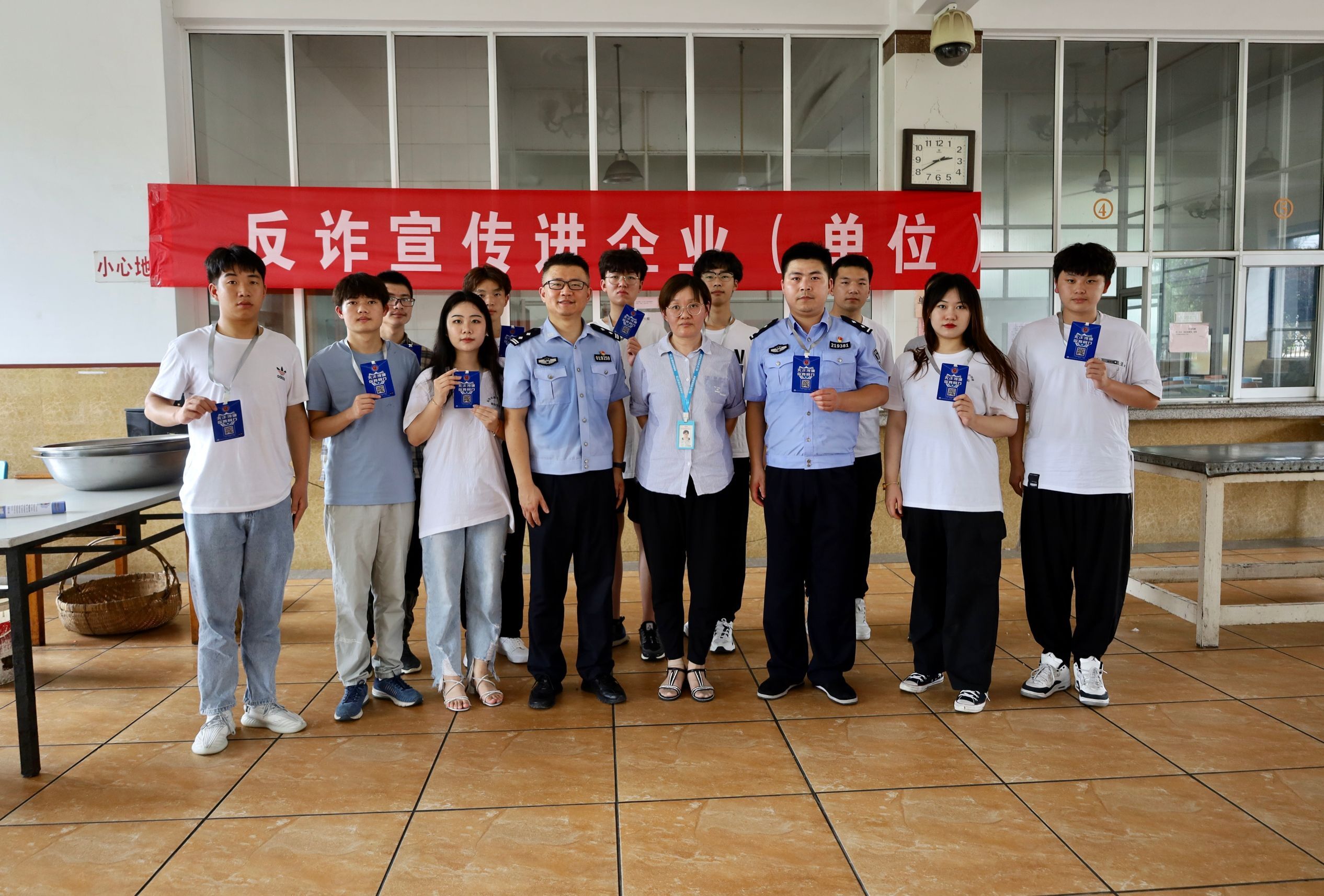 为了加强高淳群众电信网络诈骗防范意识,避免公民财产受到侵害。古柏镇派出所联合南京机电学院大学生志愿者团队,在2021年7月10日12点在南京凯莱服饰有限公司食堂,进行反诈骗宣讲及“金钟罩”注册活动。全力做好反诈宣传,提高群众的反诈意识。