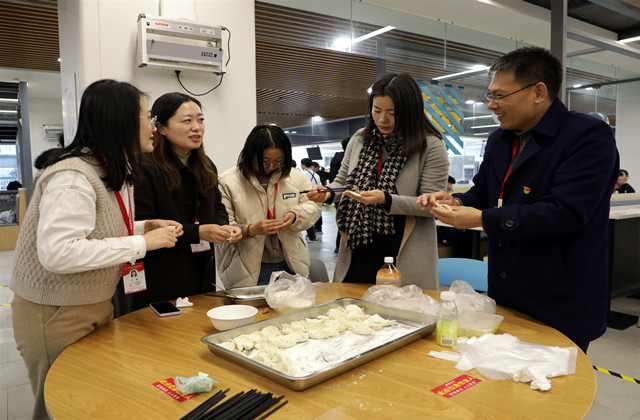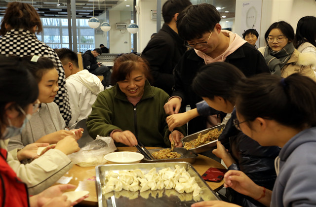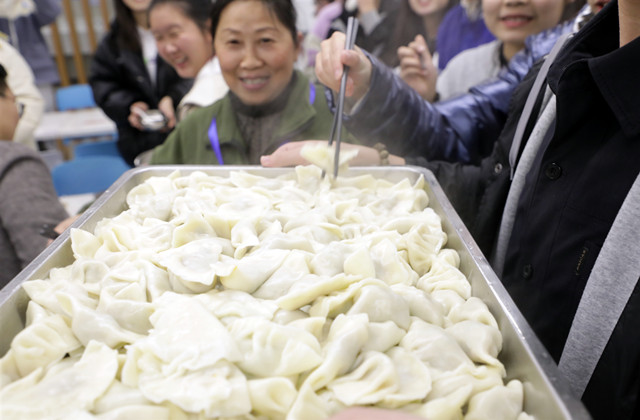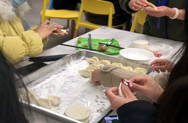 16时30分,我校党委委员、工会主席姜振宇,学生工作处处长张宝中,团委书记唐钰峤,人文社科系副书记叶绘,学工处老师和宿管阿姨与同学们齐聚食堂一楼五味园。活动开始前,负责人员提前准备好饺子皮、拌馅、水、面粉,学生会成员负责分发到每一桌,确保活动的顺利开展。活动过程中,大家有说有笑,分享包饺子的乐趣,场面温馨感人、其乐融融。经过大家的不懈努力下,热气腾腾的饺子在期待中被端上了餐桌,吃着象征着自己劳动成果的饺子,同学们都感受到青春的快乐和集体的温暖。