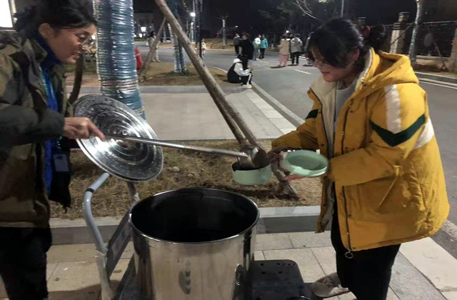 17时20分,张进宝老师带领学生会生活部成员在宿舍楼底免费分发精心熬制的暖心八宝粥,同学们满怀暖心笑容有秩序的领取这份冬日里的“小温暖”,一碗粥、一份情,粥香弥漫整个校园,感受到了浓浓的温馨与祝福。