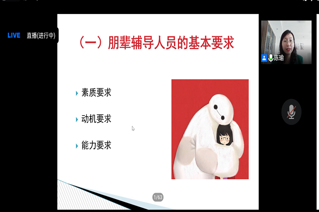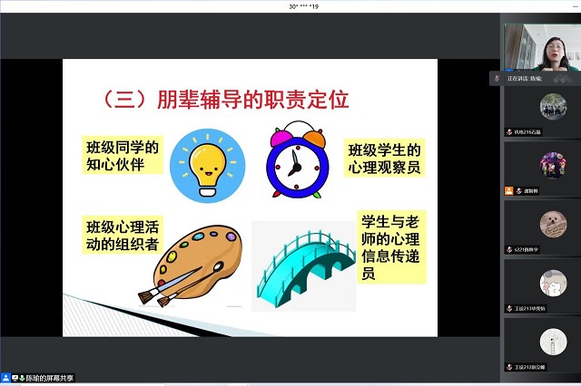 然后,陈瑜老师从朋辈辅导人员的基本要求、朋辈辅导的职责定位、朋辈心理辅导的实质、朋辈心理辅导的技巧这几个方面展开详细解说。