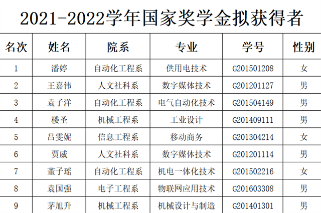 根据《省教育厅关于做好2022年普通高校国家奖学金有关工作的通知》苏教助函〔2022〕9 号、《教育部 财政部关于印发<本专科生国家奖学金评审办法>的通知》教财函〔2019〕105号、《江苏省学生资助资金管理办法》、《江苏省学生资助管理实施细则》文件精神。我校认真落实国家奖学金评审相关细则,各系部通过召开系部国家奖学金评审小组会议,认真贯彻落实国家奖学金评定要求,本着公开、公正、公平的原则,经学生个人申报,班级评议通过,上报系部评议小组,系部对申请学生各项指标、材料进行初审并提出意见,经系部同意,公示完毕,正式上报学校大学生资助管理中心。经学校大学生资助管理中心复审,逐一核实各系部提交国家奖学金候选人材料,核实无误后,上报学校国家奖学金评审领导小组,经学校国家奖学金评审领导小组同意,于2022年10月13日组织召开学校国家奖学金评审会。拟确定九位同学为乐投线上平台(集团)官方网站2021-2022学年国家奖学金获得者。