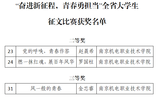 近日,根据《省委教育工委 省教育厅关于公布 “奋进新征程,青春勇担当”全省大学生 征文及演讲比赛结果的通知》(苏委教函〔2023〕1 号)公布的获奖名单,我校学生赵晨希征文作品《党的呼唤,青春作答》、罗国柱征文作品《燃一抹红魂,展百年风华》荣获省赛二等奖,金芯睿征文作品《风一般的青春》荣获省赛三等奖。