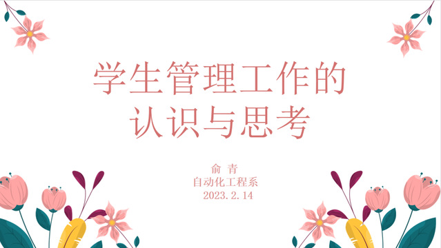 本期沙龙邀请了自动化工程系专职辅导员俞青担任主讲人。俞青老师围绕“学生管理工作的认识与思考”主题进行专题分享,从“为什么要管理”“管理些什么”“怎样来管理”三个方面展开讲述。俞老师根据辅导员九大工作职责,归纳出管系统、管重点、管过程、管自我四个要点,强调学生是根基、组织是框架,管初心是根本、管执行是保障、管风险是阀门。辅导员还要做好自我形象管理、自我情绪管理、自我成长管理。