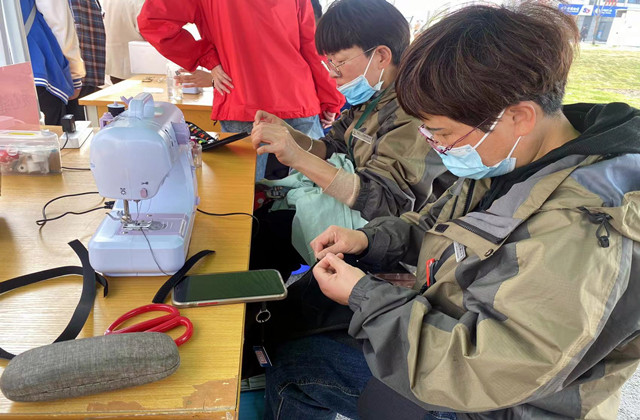 旁边就是爱心缝补的现场,不少同学拿着需要缝补的衣服来到现场,请工作人员为他们缝补,接过衣服后,仔细查看需要缝补的地方,并与同学们沟通预期的样式和效果之后,麻利的动起手来,飞针走线,缝缝补补,忙得不亦乐乎。当一件件破损的衣物在工作人员的手中,那么几下就立刻恢复原貌时,同学们开心极了,连声说:谢谢!而工作人员也为能够帮助到同学们而高兴,脸上一直洋溢着微笑,正所谓赠人玫瑰,手留余香!