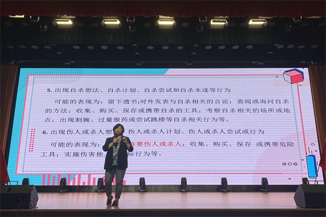 为提升我校心理骨干对于校园心理危机的预防能力,我校学生工作处大学生健康成长中邀请南京师范大学心理中心主任向莉莉老师于4月18日在青春剧场开展关爱青少年生命健康“润心”行动之“校园心理危机识别与应对”专题培训。本次培训由大学生健康成长中心龚智俐老师主持,2021、2022级心理委员、寝室长代表、楼层长、校学生会心协部等同学参加了此次培训。