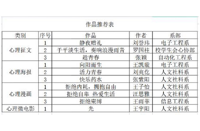 本着公平、公正、公开的原则,大学生健康成长中心邀请党委办公室、质控办、教务处、工会等部门共7位评审,对所有作品进行匿名评选。经过认真的评比与筛选,最终推选了三篇心理征文、三幅海报、三幅漫画以及一部心理微电影至江宁大学城参加比赛。具体推选作品如下: