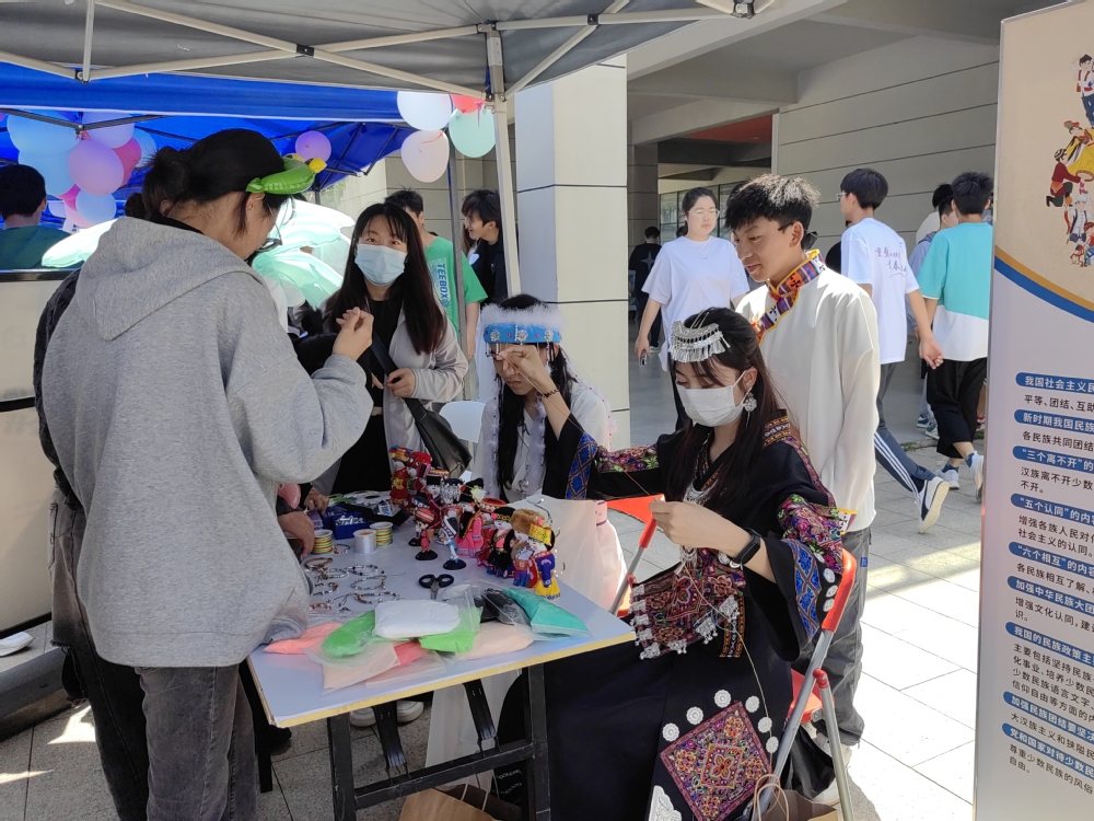 红石榴班的同学们展示民族经典的服饰、语言及风情文化,吸引众多学生驻足欣赏与交流。现场许多同学对编制民族特色手链和饰品兴趣浓厚,纷纷参与互动活动中。