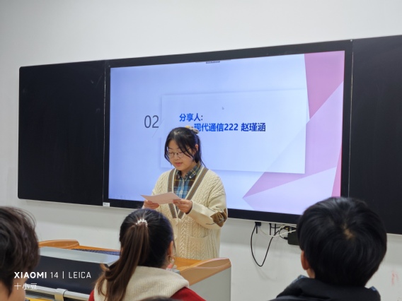 接下来由现代通信222班的赵瑾涵同学为同学们分享经验。她认为建立积极健康的班级氛围非常重要,其次,及时沟通和反馈也是管理班级的重要组成部分,接着她向同学们分享了明确的管理目标和计划:建立良好的沟通渠道、鼓励参与合作、服务支持、建立班级规章制度和定期组织班委会与反馈。