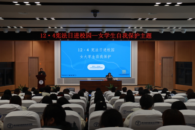 下午1:00在我校乐学楼102报告厅开展了“12·4国家宪法日进校园——女生自我保护”为主题讲座,江苏玄览律师事务所合伙人、高淳区党外知识分子联谊会会员、政协委员孙玉清律师任主讲人。孙律师从日常生活、恋爱、就业三个方面深入为大家讲授了女学生可能遇到的法律风险和自我防范保护措施,希望今后各位同学要做好自我的保护,爱惜自己。国家以宪法的形式对女性权益进行了规定,表明了国家对女性权益的高度重视,保障了女性合法权益,促进男女平等,充分发挥女性在社会中的作用。