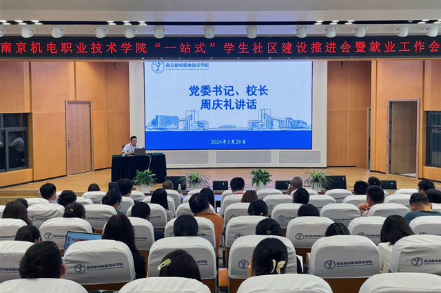 5月28日下午,学生工作处在乐学楼报告厅召开“一站式”学生社区建设暨就业工作会议,学校党委书记、校长周庆礼,党委副书记、副校长赵学洪,党委委员、副校长刁爱军,党委委员、副校长孔德丽,党委委员、纪委书记姜振宇,以及各职能部门负责人、系部主任、书记、专业负责人、全体辅导员、思政中心全体人员、招生组长100余人参加会议。会议由学生工作处处长张宝中主持。