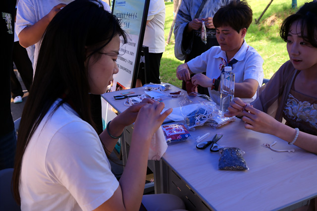 活动期间,同学们收获满满,额头上画着驱邪图案,腰间佩戴着香薰片和香囊,手腕上戴着五彩色手绳,持一把自制漆扇,与同学在棋桌旁博弈,将传承文化发挥得淋漓尽致。