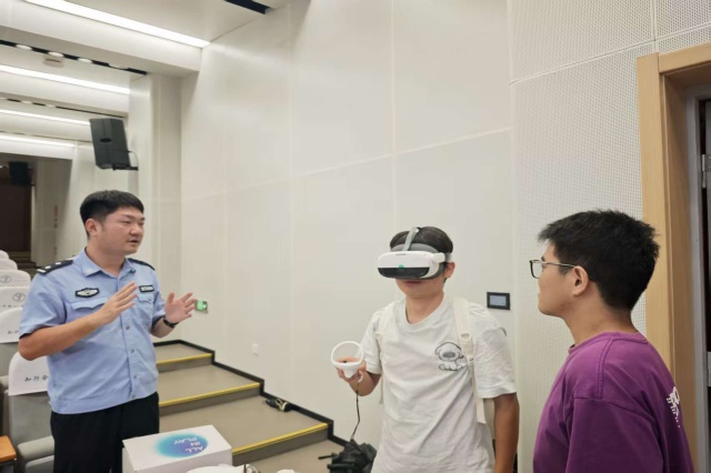 宣讲结束后,活动进入实物观摩与科技体验环节。在毒品仿真模型展区,学生近距离观察各类毒品形态,民警现场讲解辨识技巧,切实提升学生对毒品的现实认知和防范能力。现场设置的VR毒害模拟体验装置,通过虚拟现实技术使学生沉浸式感受吸毒带来的身心危害,极大增强了宣传教育的效果和感染力。互动问答环节中,同学们踊跃参与,进一步巩固了禁毒知识学习成效。