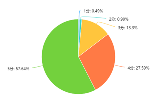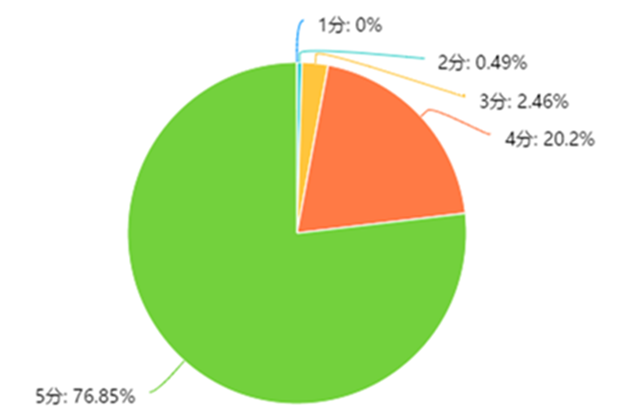 在对线上教学质量总体满意度进行评价时,满意度4分以上的占89.17%,认为不满意的学生仅有0.49%(详见图4:线上课程教学总体满意度程度),说明大多数学生对线上教学质量是满意的,教学效果较好。从线上、线下课程比较来看,与线下课程教学质量相比,满意度4分以上的占85.23%(详见图5:与线下相比对线上课程教学质量的满意度),该项满意度是所有满意度中最低的,学生认为相比较而言线下教学效果更好,更期待教室上课。