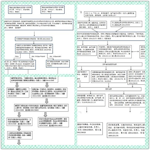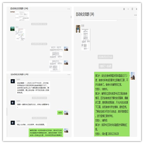 系部从2月17号开始组织了我们全系老师对学校的疫情防控方案进行了系统的学习,虽然不能面对面讨论,但是QQ和微信成了我们每日讨论的平台。学习讨论之后,全系教师在刁院长的带领下进行了对各种假设情景的讨论,针对不同的情境做出处理的流程图。