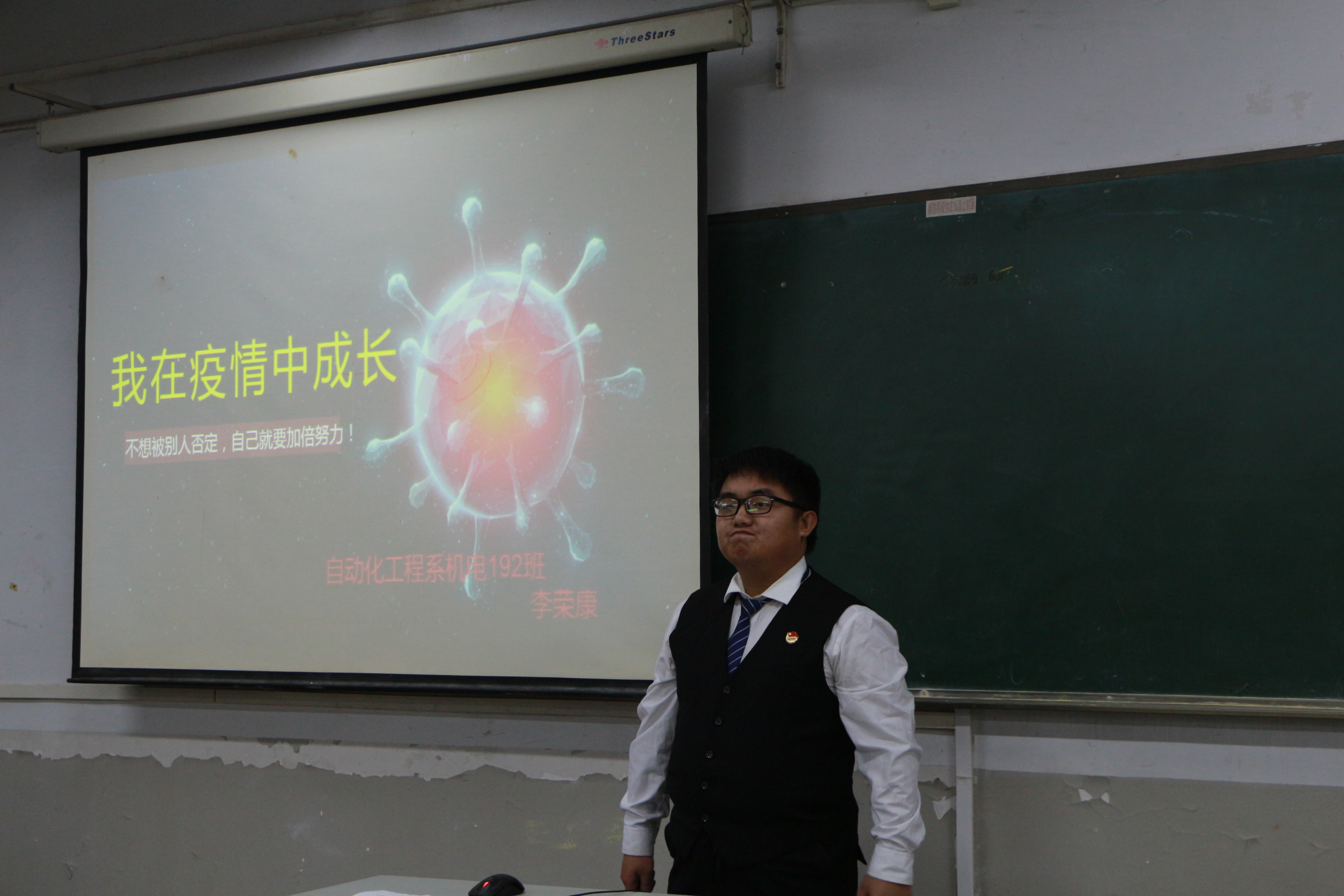 在比赛过程中,参赛选手们围绕“同心战“疫”,同“屏”共振”、“习语近人——我最喜爱的习近平总书记的一句话”、“全面打赢脱贫攻坚战”、“跨过鸭绿江——纪念中国人民志愿军抗美援朝出国作战70周年”和“让青春在党和人民最需要的地方绽放”五个主题进行演讲。同学们在台上演讲慷慨激昂,紧贴主题,聚焦当代热点时事。不仅说出了自己的想法,也提出了有建设性的建议。评委老师在台下认真聆听,公正负责地为选手打分。最终供用电202班的潘婷同学和机电192班的李荣康同学斩获本次比赛的一等奖,并代表系部“出征”今年的“我是演说家”院级决赛。