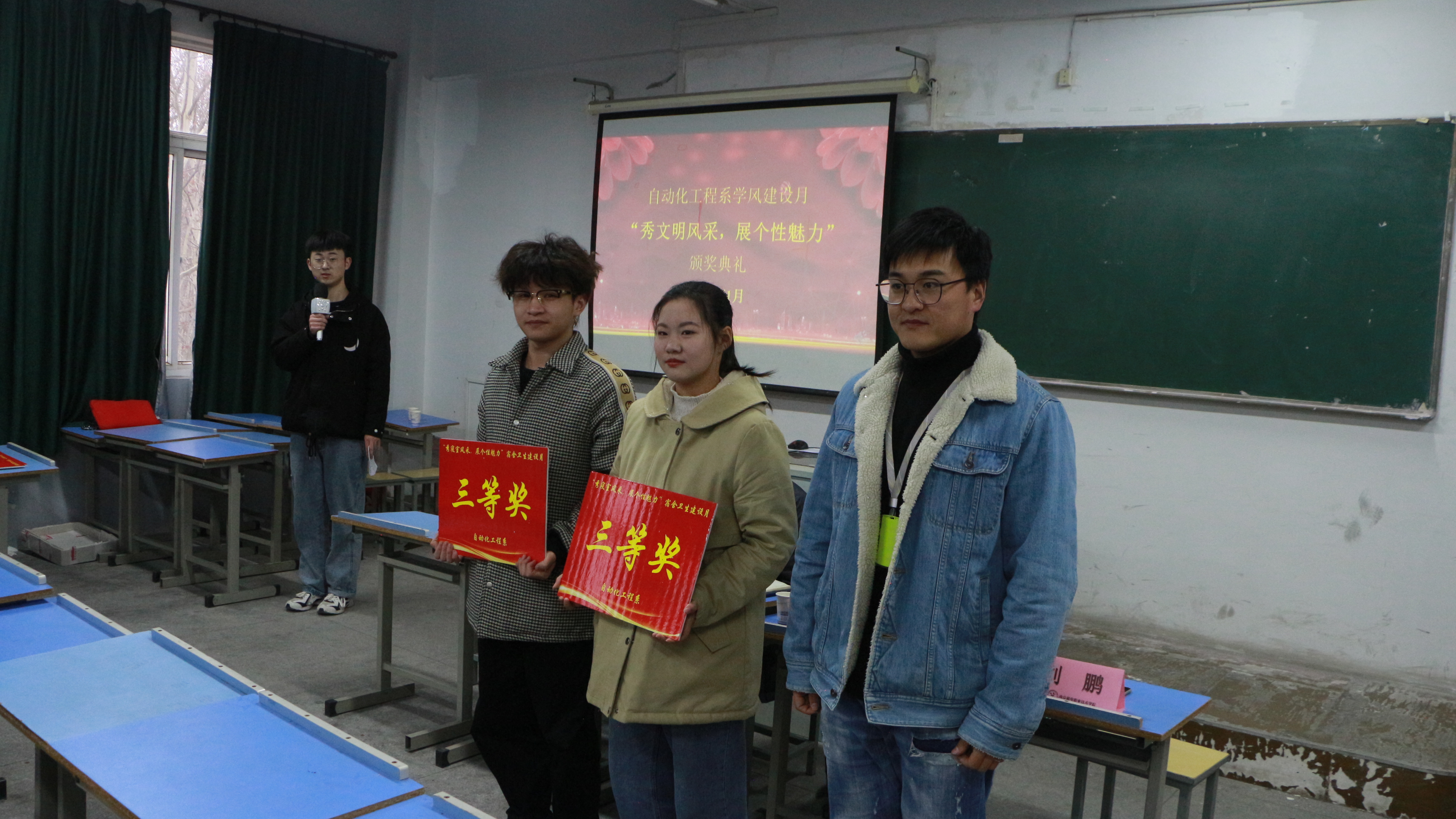 2021年1月5日,为响应我校学风建设,我系于2020年11月举办了宿舍卫生安全的主题活动。为表彰此次活动中表现优异的宿舍,我系于1月5日下午四点在知行楼511举办了颁奖典礼。出席颁奖典礼的主要有自动化工程系高水冕书记,学生会指导老师朱妍焘老师,辅导员刘鹏老师和俞青老师以及获奖宿舍。