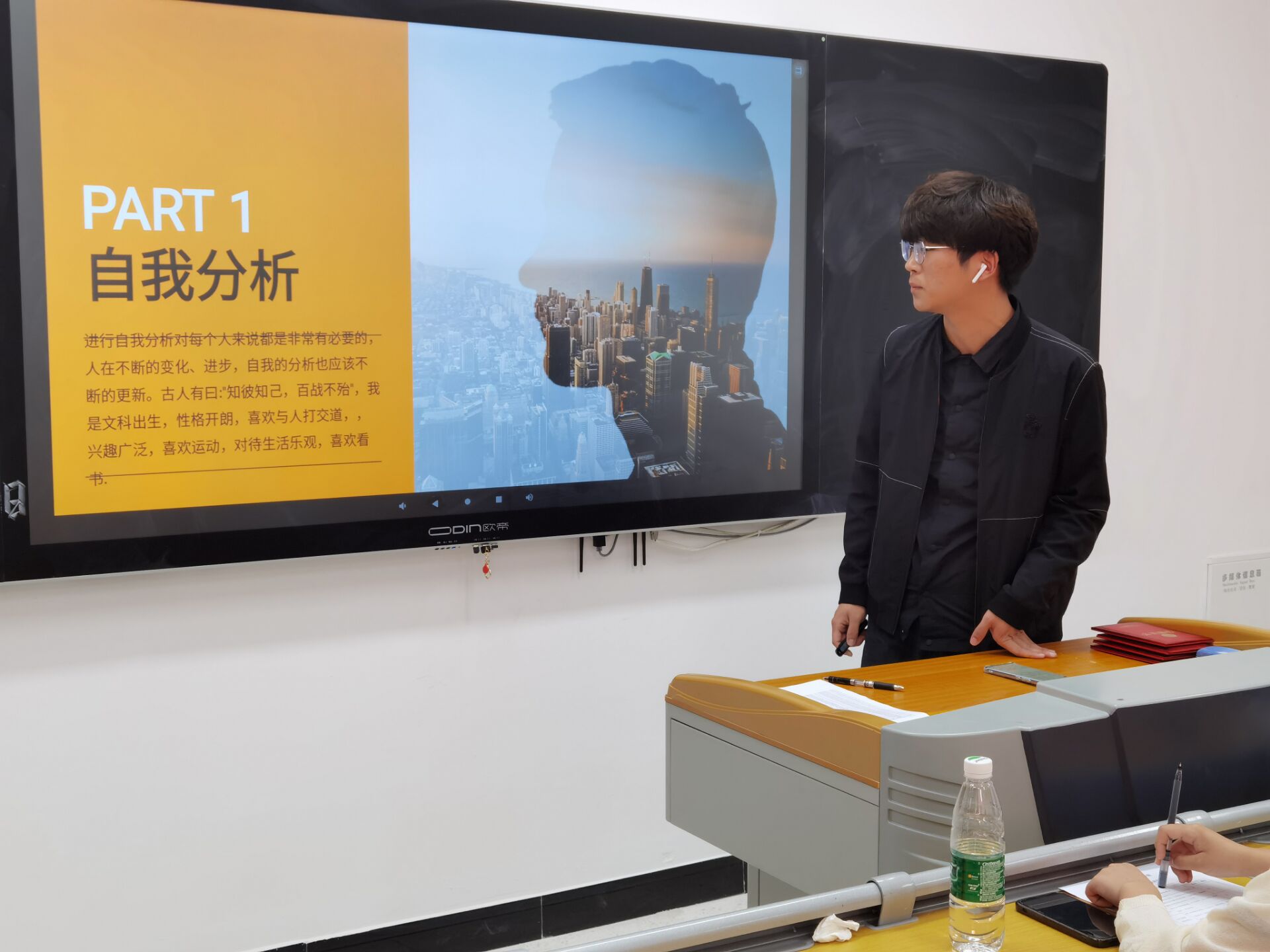 本次初赛主要由赛前开场、时间把控、PPT演讲、规划书展示、抽题问答及最终的统分颁奖环节构成。在赛前开场环节,各同学通过轮流发表竞赛宣言;接下来,选手们通过ppt展示了其职业规划与目标,选手立足专业基础,阐述了合理、清晰的职业规划与选择,制定合理有效的短期与长期目标;在职业规划书展示环节中,各位选手呈现前期撰写的职业生涯规划书,阐述写作思路和框架,结合提问环节,回答评委提出的职业规划相关问题。