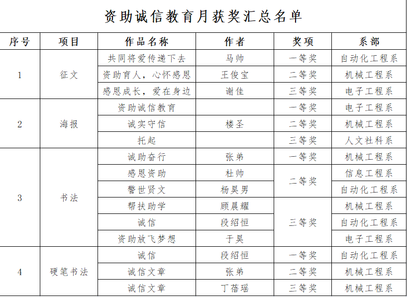 我系认真组织各班级同学参与资助诚信教育月活动中,经过各位辅导员的共同审核,提交了包括征文、海报、书法等作品,经过学院资助中心的评选,我系电气202班马帅获得主题征文一等奖;机电195班段绍恒获得书法一等奖、二等奖;机电202班杨昊男获得书法二等奖。