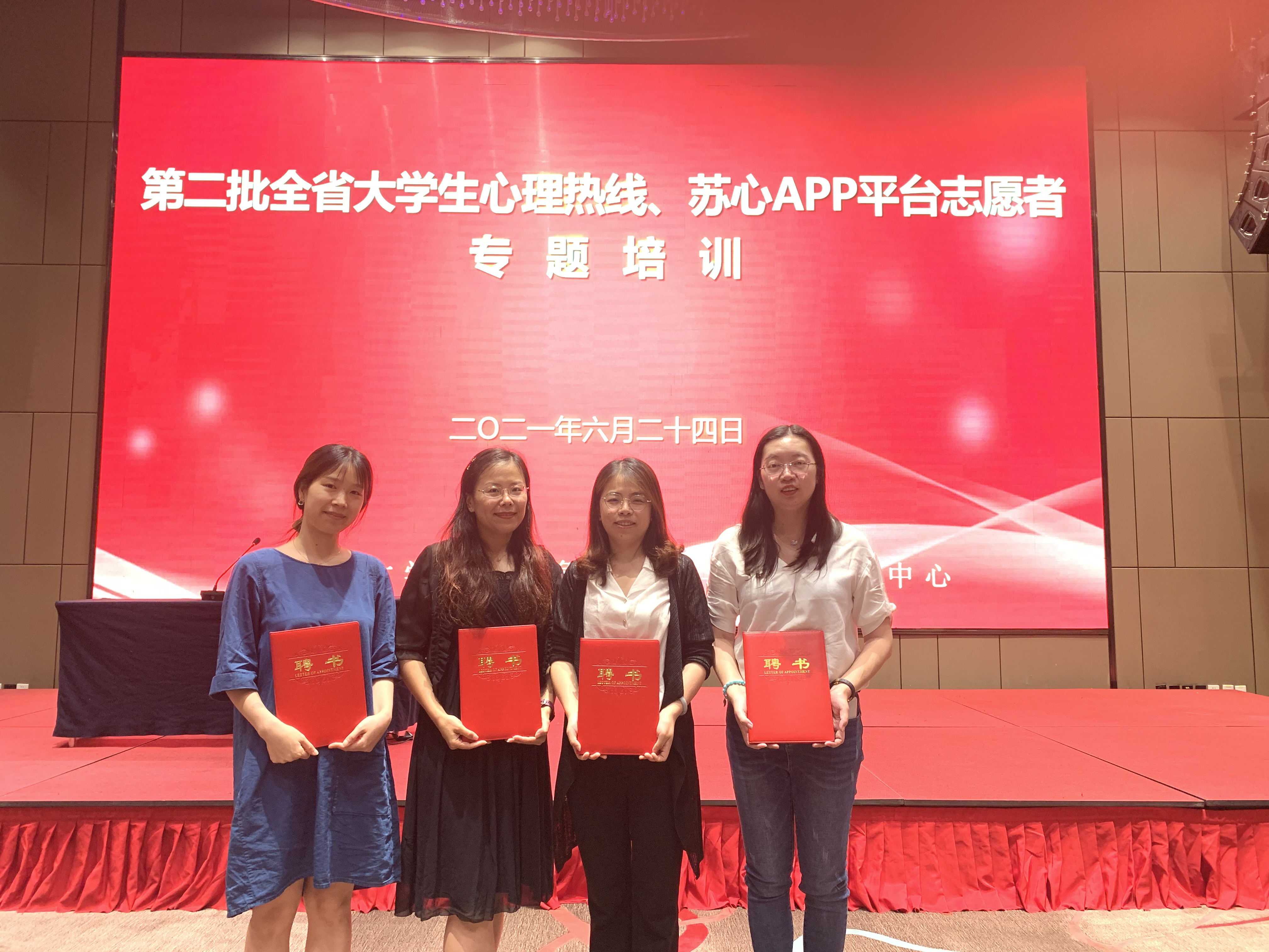 江苏省大学生心理危机预防与干预研究中心在6月23至24日举办了第二批“苏心”App及心理热线志愿者专题培训,我系心理辅导员袁佳参加培训,并且被聘为大学生心理自助平台(苏心APP)志愿者,聘期两年。