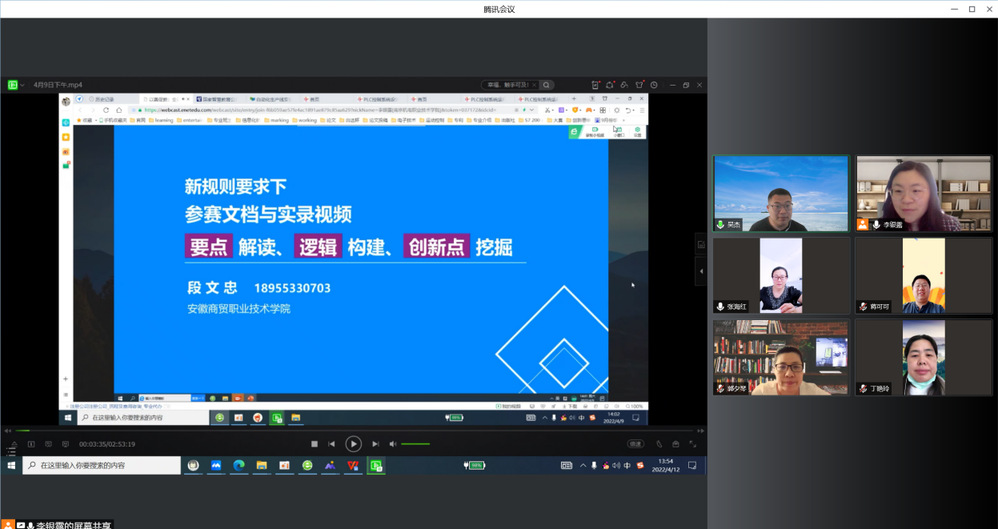 随后,教研室所有老师共同观看了安徽商贸职业技术学院段文忠教授主讲的“新规则要求下,参赛文档与实录视频的要点解读、逻辑构建和创新点挖掘”培训视频,通过段教授的精彩分享,让大家深受启发,老师们表示“干货满满”。大家针对视频观看和自己教学经验进行了充分讨论。郭夕琴老师提出,教学大赛应对照专业标准、行业标准、职业岗位标准设计课程与教学内容,教学内容的选取要注重趣味性和知识的深度。吴杰老师认为,教学能力比赛不是单靠一个人的力量就可以完成的,它需要整个团队的智慧和集体的力量。丁艳玲老师认为应根据比赛文件精神,结合当前职业教育理念,落实育人根本任务,让思政教育进课程、进课堂。