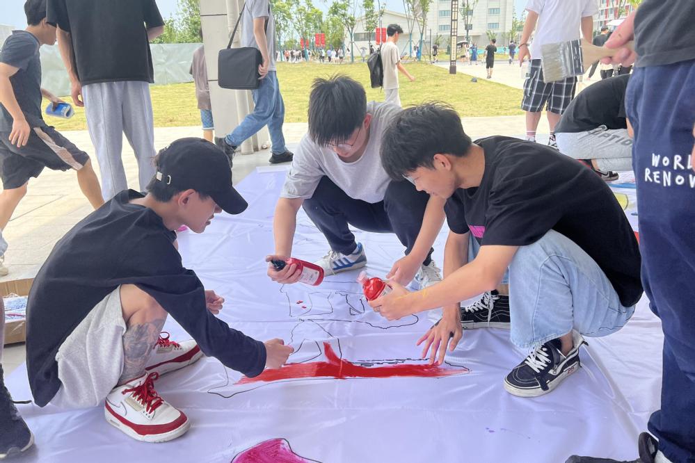 参与活动的同学在操场上使用丙烯颜料绘制主题“追梦人”的巨型画布,活动现场热闹非凡,同学们全然不介意手上、衣服上的颜料,专心绘制,仿佛正在绘制他们多彩的人生。此外,路过的同学也被轻松有趣的氛围所吸引,主动加入到活动中,大家齐心协力共同绘制的同时,既完成了画作收获了快乐。最后,大家与作品合影留念。至此,本次主题活动圆满结束。