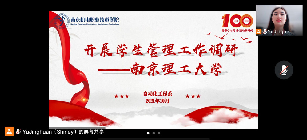 为进一步推动学校辅导员工作上层次、上水平,强化服务育人理念,加快辅导员队伍职业化、专业化建设,10月28日,自动化工程系与南京理工大学辅导员就学生管理工作问题开展调研讨论分享会,受疫情影响,此次调研交流采取线上的方式进行,系部书记高水冕,学工干事,专职辅导员参与本次调研交流,南京理工大学学工处封瑜主任,辅导员代表蒋平,葛友嘉,顾华,马月净,缪轩,欧明泉老师参加了调研交流。