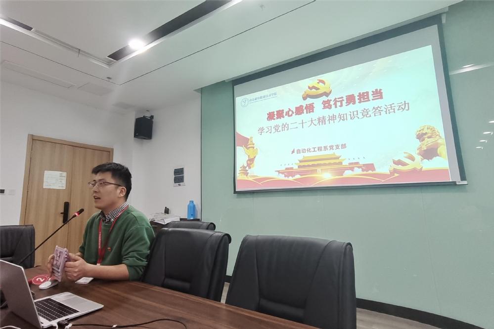 本次活动采用现场竞答的形式进行,竞答题目题型分为单选题,多选题,内容涵盖党的二十大报告、《中国共产党章程》和中国共产党党史等,比赛时长为10分钟,总分100分。活动由支部宣传委员潘久伟主持,全系教师积极参与,现场气氛活跃。每道题目抢答结束后潘老师又对题目进行了详细的解答,党员同志们边答边学,极大地提升政治理论学习的实效性。
