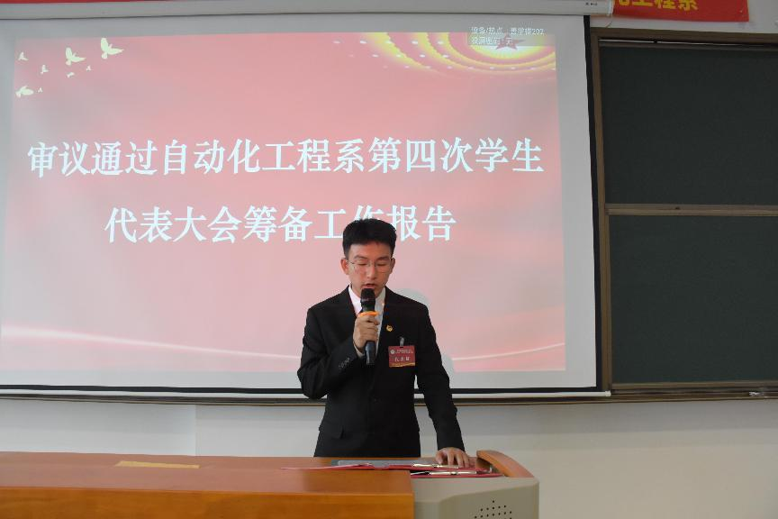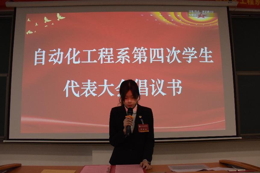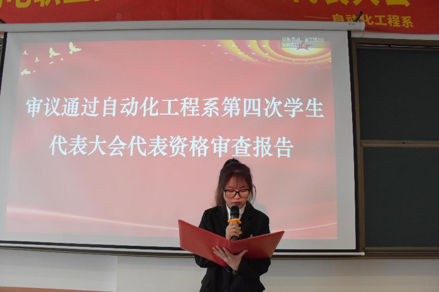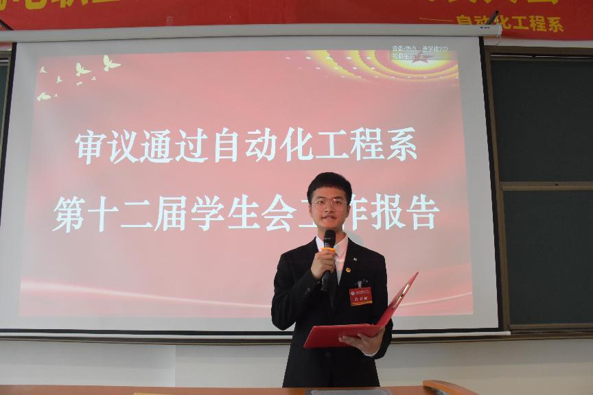 赵乾同学宣读审议通过自动化工程系第十二届学生会工作报告。