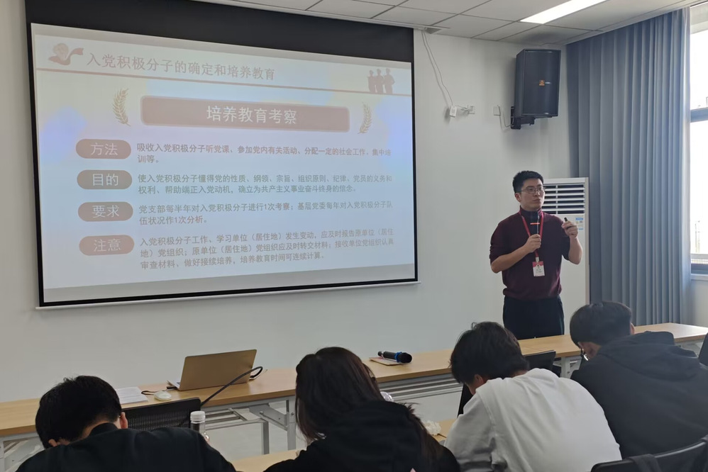 11月15日,我系开展了题为“发展党员工作流程”第二讲党课,本次党课由党支部宣传委员潘久伟老师主讲。潘老师向同学们强调了发展党员的重要意义和成为共产党员的基本条件,并具体说明了发展党员工作流程的五个阶段。